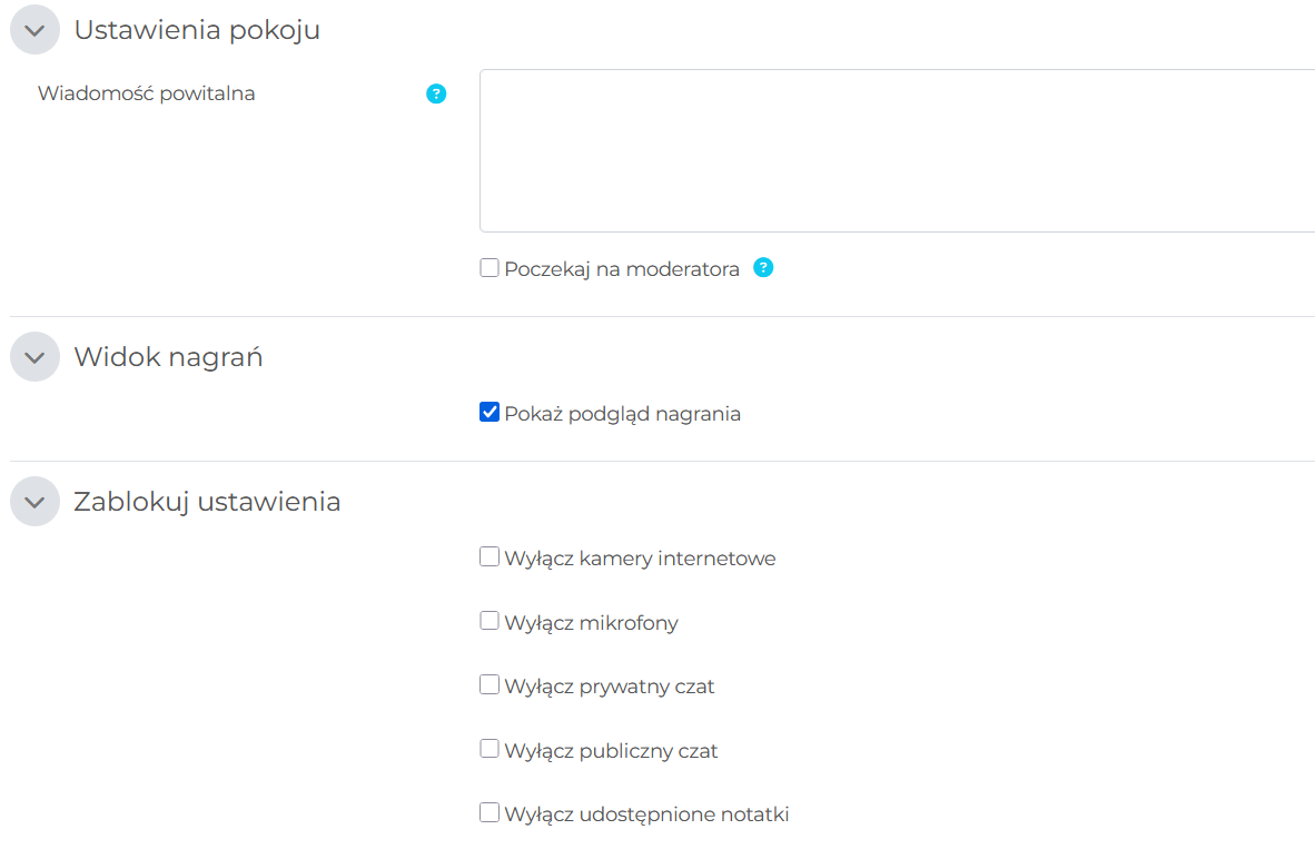 - Pokój/aktywność z nagraniami – wideokonferencja z opcją nagrywania.