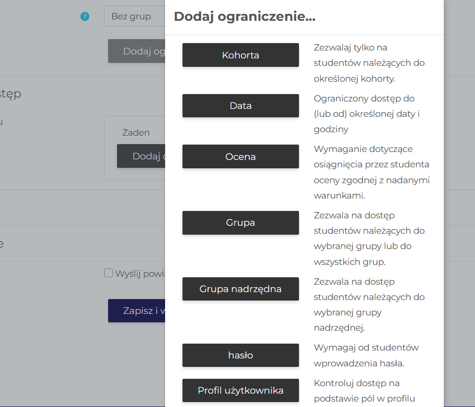 - Możliwe jest dodanie ograniczenia dostępu np. ustawienie, że student musi należeć do wydziału, kierunku, grupy dziekańskiej.