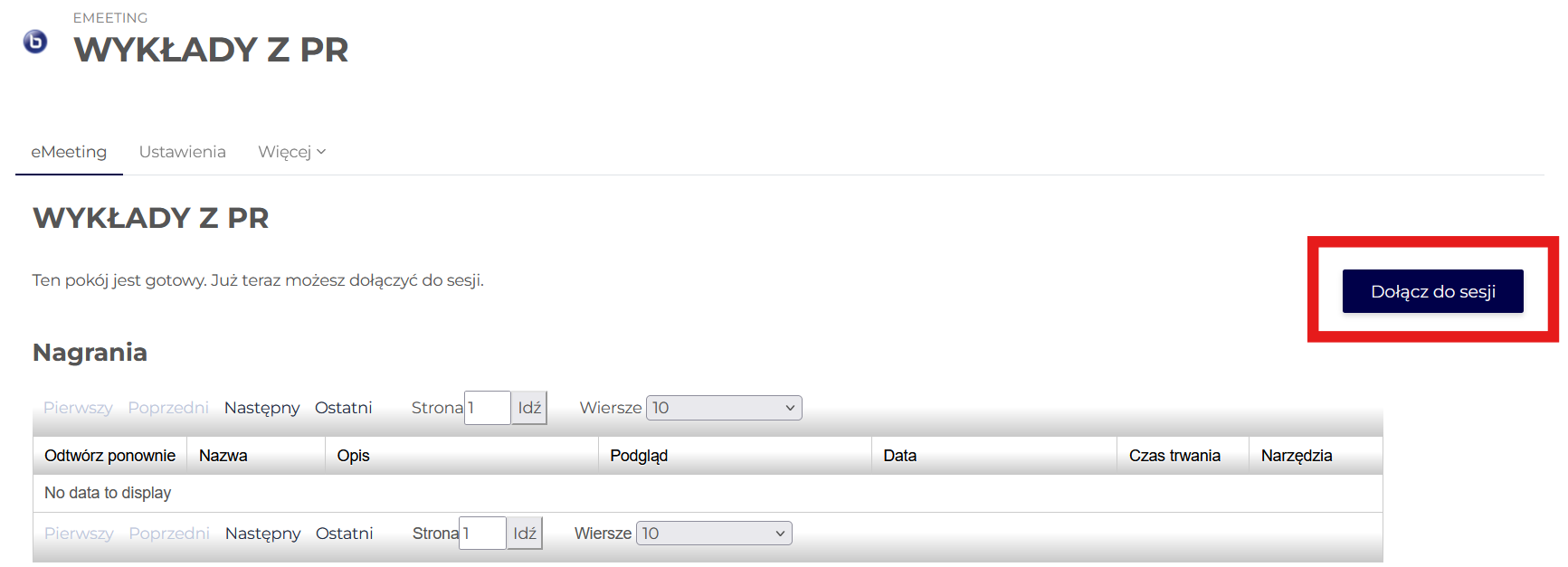 Otworzy się strona z opcją dołączenia do pokoju. Należy kliknąć „Dołącz do sesji”.