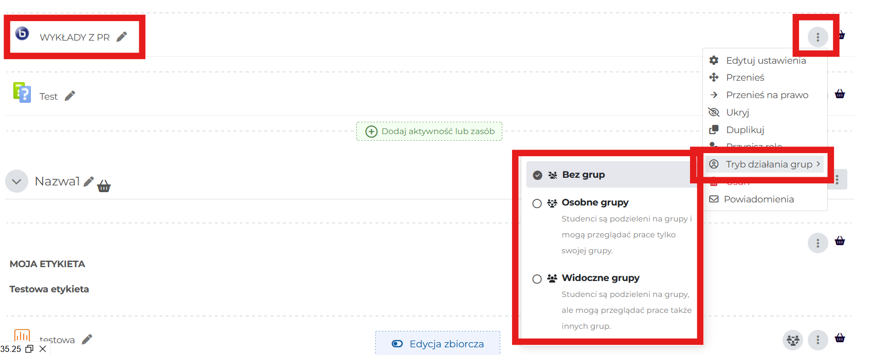 Włączenie opcji osobne grupy dla pojedynczej aktywności: