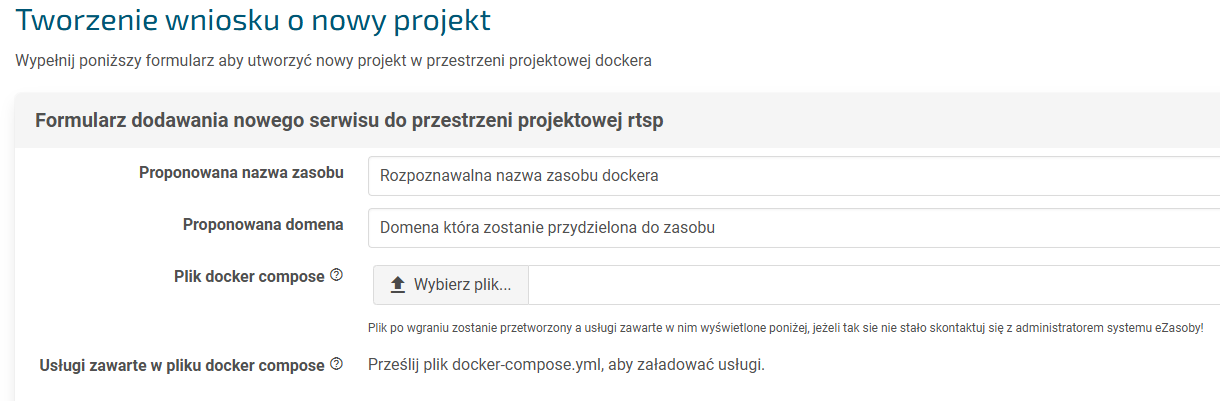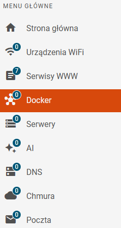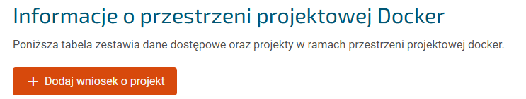 W celu stworzenia wniosku o Docker należy zalogować się do systemu eZasoby następnie z meny po lewej stronie wybrać Docker.