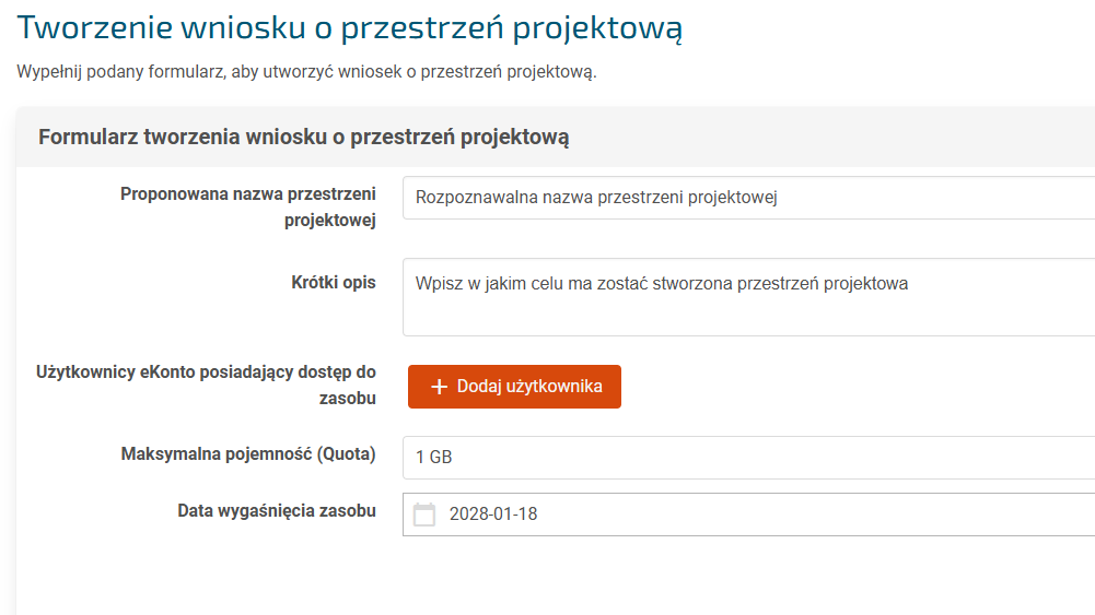 Pierwszym krokiem jest stworzenie przestrzeni na projekty po przez kliknięcie przycisku + Dodaj przestrzeń projektową.