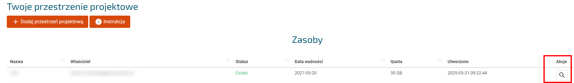 Na liście Zasobów pojawi się nasza przestrzeń projektowa. Wówczas klikamy ikonę Lupy w kolumnie Akcja w celu dodania projektu do naszej przestrzeni.