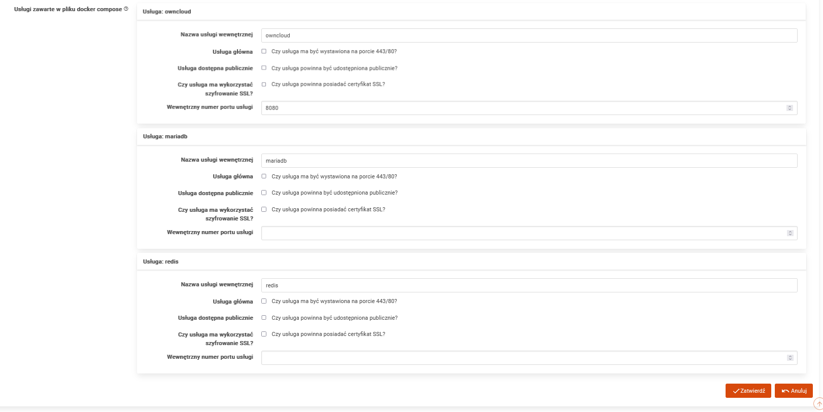 Po przesłaniu pliku docker compose pojawi się dodatkowy formularz (przykład poniżej) w którym możemy zaznaczyć dodatkowe opcje.