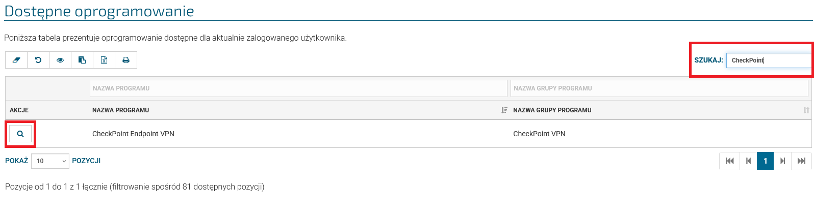 Nad tabelą po prawej stronie w okienku zacznij wpisywać nazwę CheckPoint Endpoint VPN, w tabeli pojawi się pozycja, której szukamy. W jej wierszu kliknij lupę w kolumnie Akcje