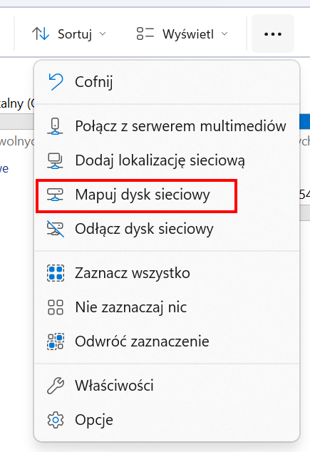 Pojawi się menu kontekstowe z ikoną Mapuj dysk sieciowy, na którą klikamy.