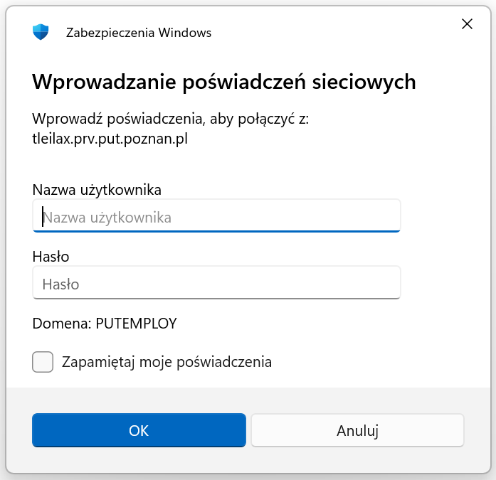 Jeśli system ma zapamiętać nazwę użytkownika i hasło po restarcie komputera, to należy zaznaczyć checkbox przy Zapamiętaj moje poświadczenia.