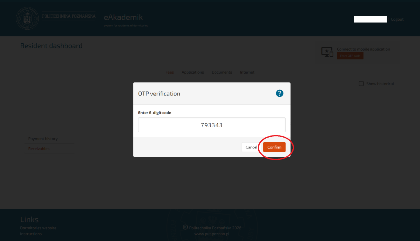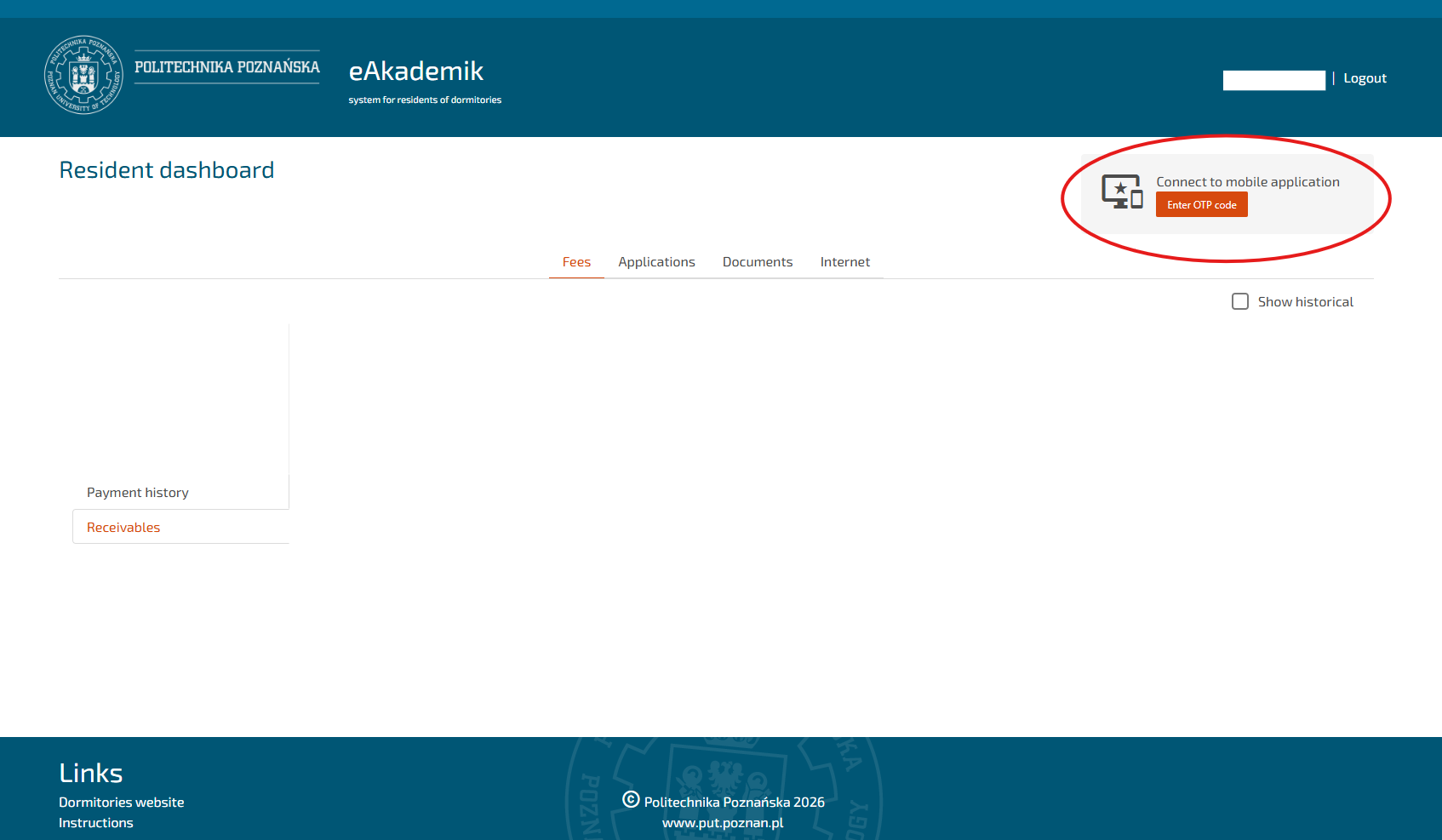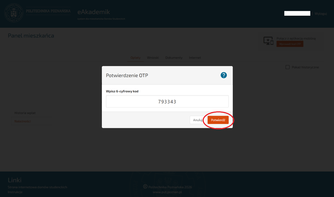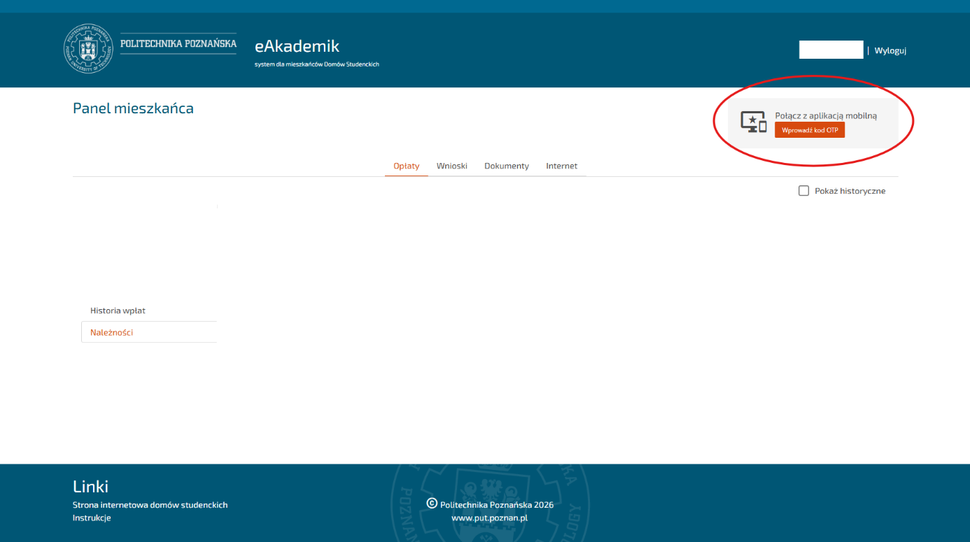 Po wygenerowaniu kodu należy wejść na stronę eAkademik (można to zrobić na telefonie lub komputerze), zalogować się do swojego panelu mieszkańca i kliknąć w przycisk Wprowadź kod OTP znajdujący się w prawym górnym rogu ekranu: