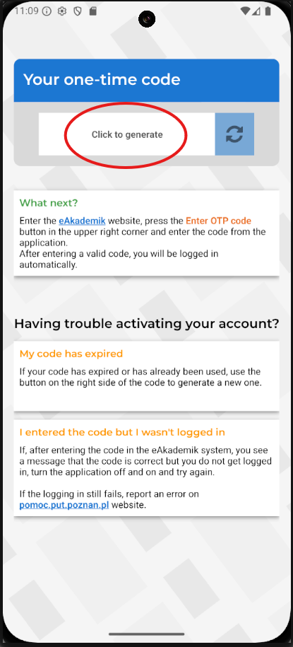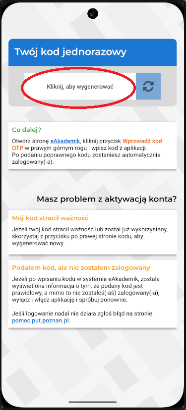 Zostanie wyświetlony ekran z polem na kod jednorazowy. Aby wygenerować kod należy kliknąć we wskazane miejsce: