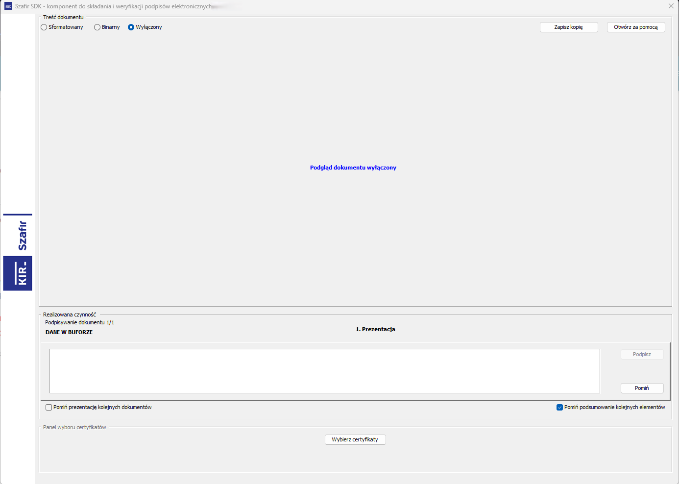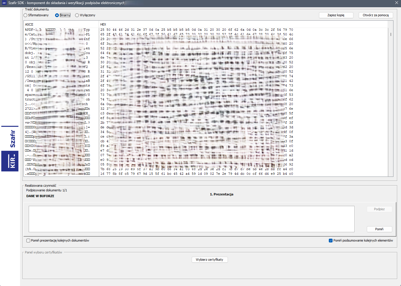 W aplikacji Szafir Host górna część okna prezentuje przetwarzany dokument, dolna część odpowiada za podsumowanie procesu podpisywania dokumentu.