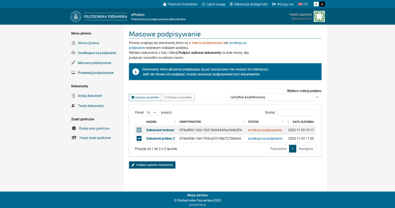 Aby podpisać wybrane dokumenty należy wybrać je z listy i kliknąć przycisk „podpisz wybrane dokumenty”. Zainicjuje to podpisanie wszystkich dokumentów (patrz: podpisywanie dokumentu certyfikatem kwalifikowanym).