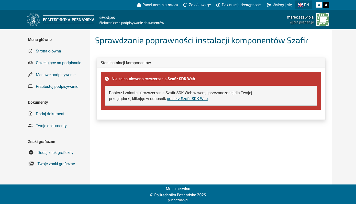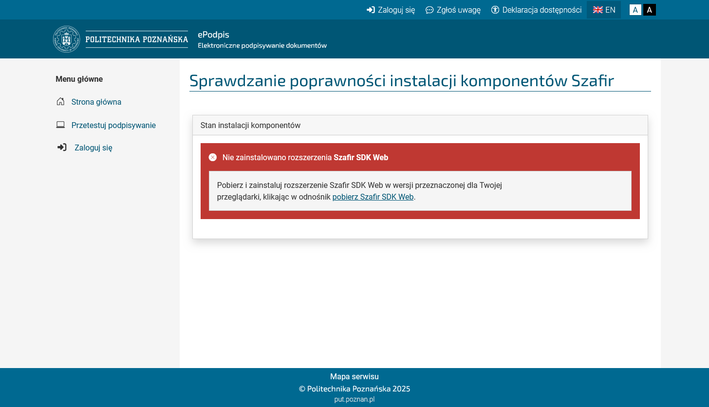 Jeśli nie zainstalowano w przeglądarce rozszerzenia Szafir SDK Web wyświetla się stosowny komunikat: