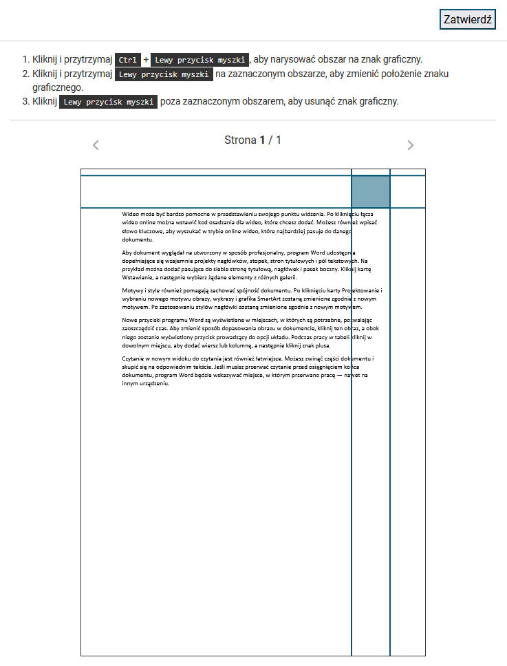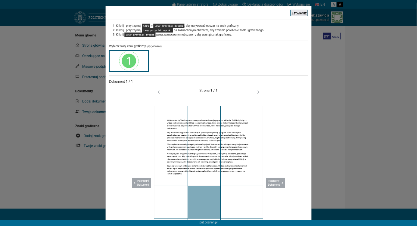 Po wybraniu kafelka „skonfiguruj miejsce podpisu”, wyświeli się podgląd dokumentu, umożliwiający wybór graficznej reprezentacji podpisu (znak graficzny) oraz oznaczenie na dokumencie miejsca, w którym znajdzie się informacja o podpisie (rysunek 22). Ustawienia mogą zostać powtórzone dla pozostałych dokumentów (przy podpisywaniu grupy dokumentów).