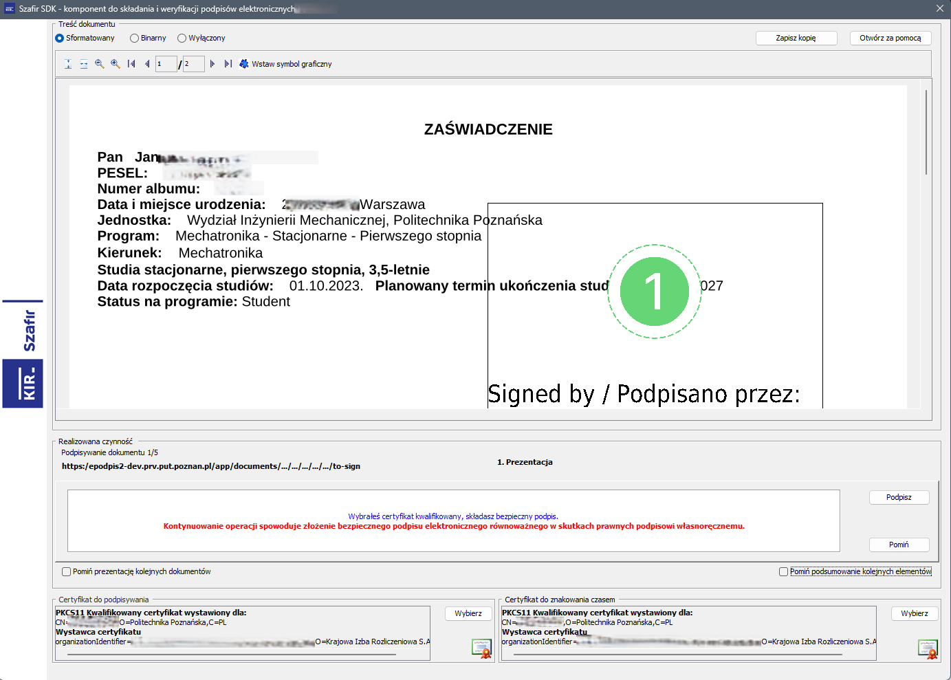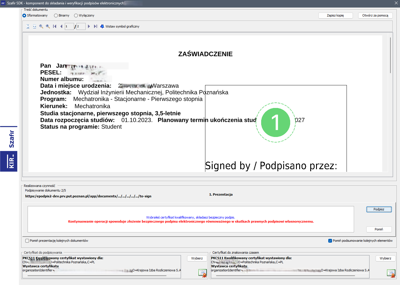 Teraz, aktywny jest przycisk umożliwiający podpisanie dokumentu w trybie testowym.