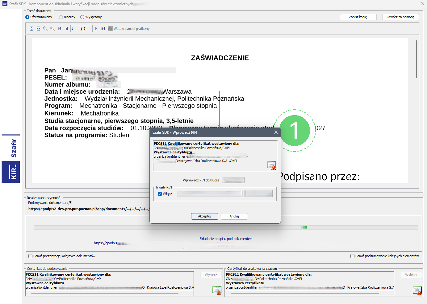 Należy uwierzytelnić certyfikat zapisany na włożonej uprzednio karcie za pomocą kodu PIN.