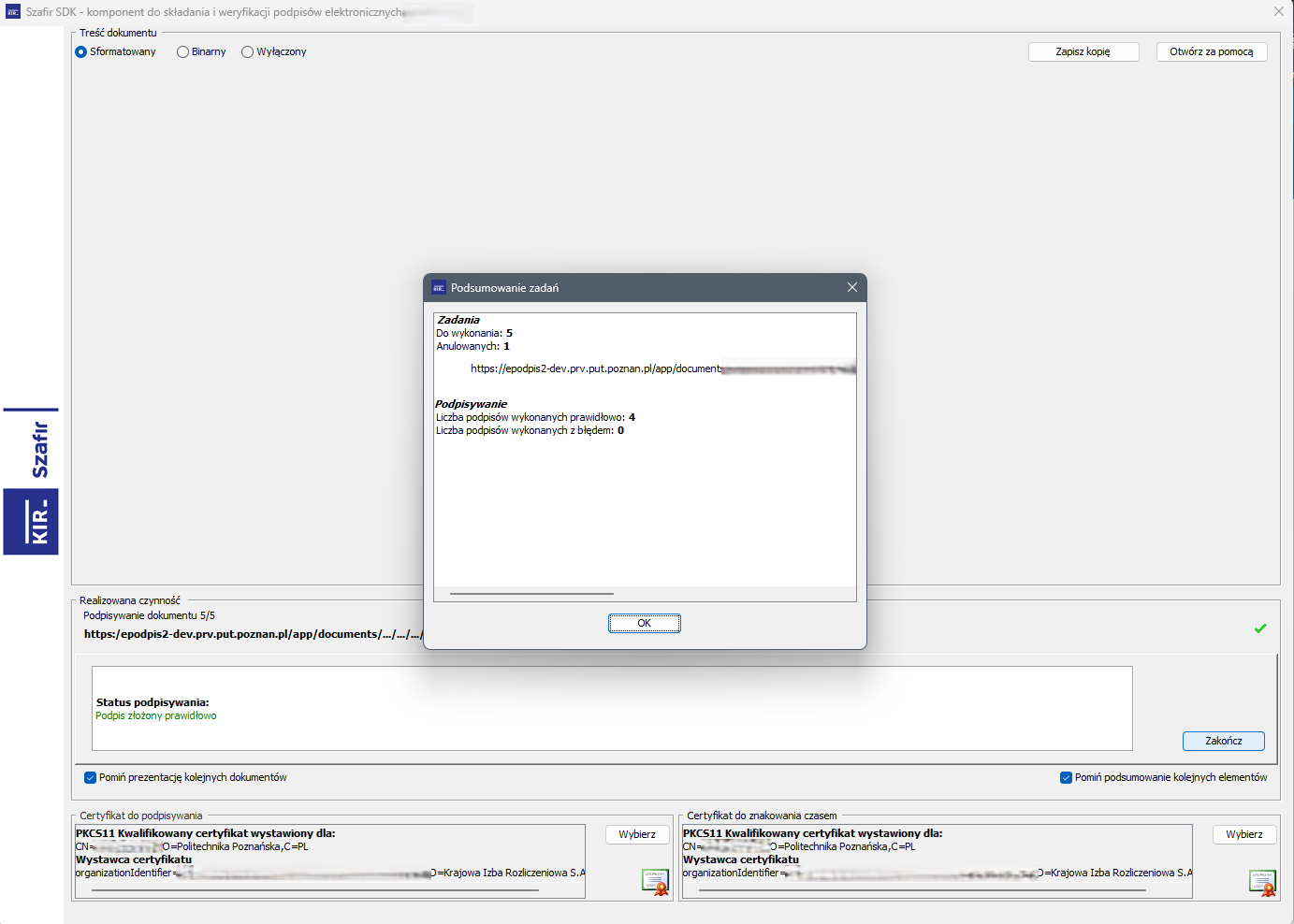 Po zakończeniu podpisywania dokumentu / grupy dokumentów w aplikacji Szafir Host wyświetlone zostanie podsumowanie zadań w oraz w przeglądarce internetowej podsumowanie procesu przetwarzania. . W przypadku podpisywania grupy dokumentów, jeśli części nie uda się podpisać, będzie można ponowić próbę podpisu dla tych dokumentów.