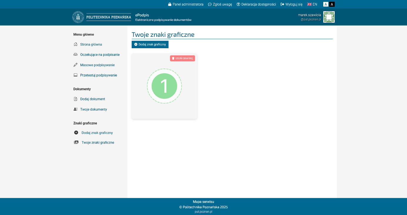 Po dodaniu znaku graficznego otworzy się zakładka „twoje znaki graficzne”.