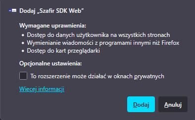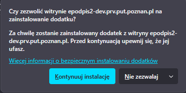 Wybranie opcji „pobierz Szafir SDK Web” skutkuje zainstalowaniem dodatku do przeglądarki (tutaj na przykładzie przeglądarki Mozilla Firefox). Należy zezwolić na instalację (Rysunek 3)