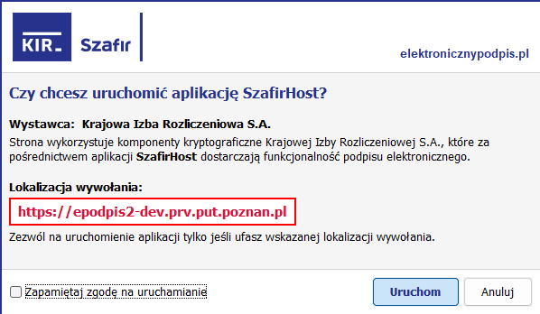Dalszy proces podpisywania zachodzi w oknie aplikacji Szafir Host, informacja o tym fakcie wyświeta się w przeglądarce.