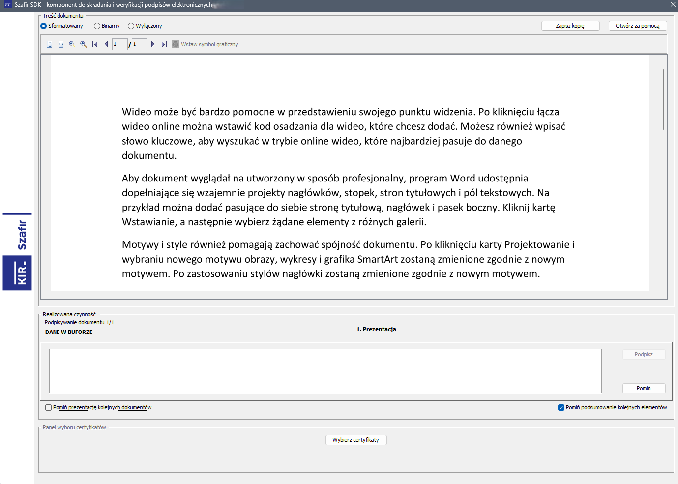 Po naciśnięciu przycisku otwiera się okno aplikacji Szafir SDK wyświetlające testowy dokument.
